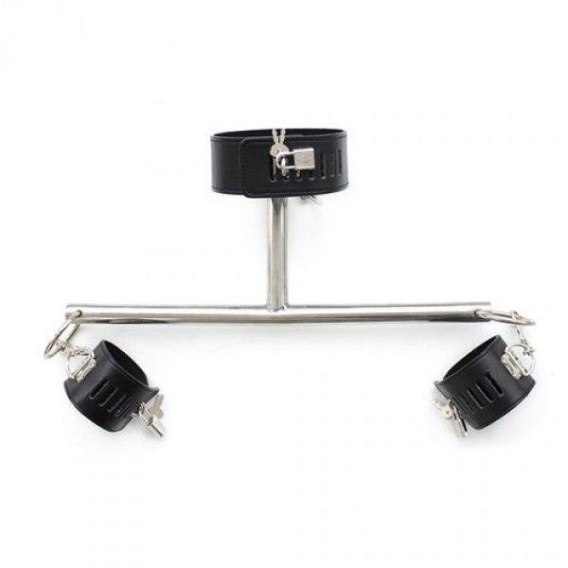 Zestaw przymusu z kajdankami na nadgarstki, kołnierzem i prętem stalowym, aby związać nadgarstki z szyją i zapewnić całkowite ograniczenie.