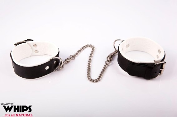 Skórzane kajdanki męskie na nogi w kolorze biało-czarnym zapinane na masywne klamry. Możliwość regulacji rozmiaru.Szerokość mankietów: 4cmDługość łańcuszka- ok. 40cmProdukt został wykonany bardzo starannie z naturalnej skóry bydlęcej. Skóra ta wyprawiana jest metodą tradycyjną, garbnikami roślinnymi w najstarszej czynnej w Polsce garbarni. Skóra ta jest bardzo mocna, a jednocześnie delikatna w dotyku, a ponadto charakteryzuje si ę ekscytującym zapachem. Posiada unikatową cechę dostosowywania się do kształtu ciała i z biegiem czasu nabiera szlachetności. Produkt bardzo dobry gatunkowo.Opakowanie: eleganckie kartonowe pudełko.