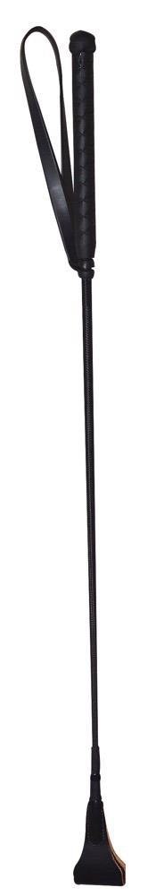 Skórzany krój z czarnej skóry z podwójną skórzaną pętlą na czubku i skórzaną pętlą na uchwycie dla bezpiecznego chwytu.Długość: 65 cm.